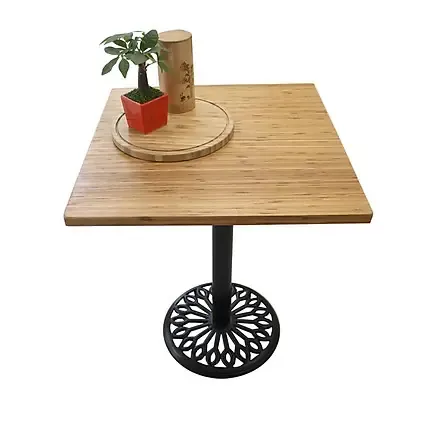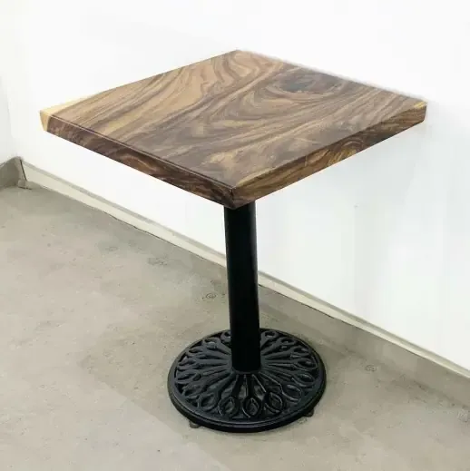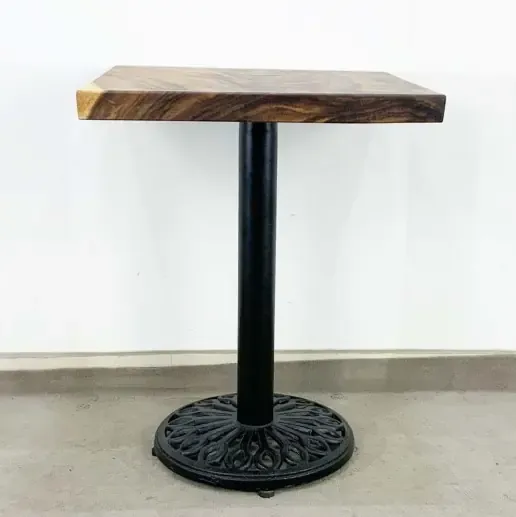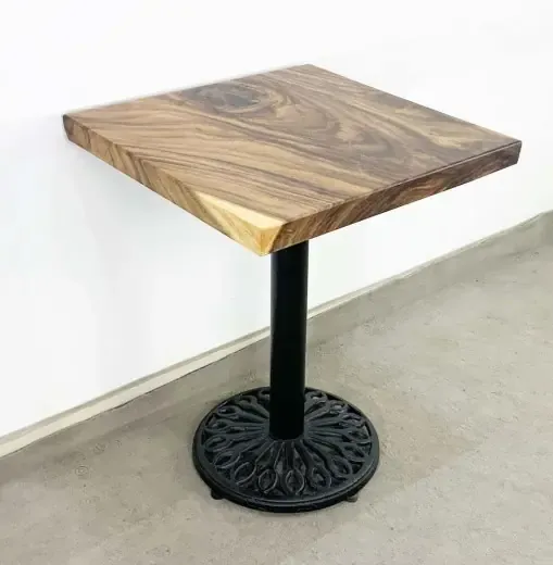 Bàn cafe vuông gỗ me tây dày 5 cm chân gangmặt bàn kích thước theo nhu cầu khách hàng chân gang đúc. Mặt gỗ được sấy và xử lý bề mặt PU kỹ càng, mặt bàn nguyên tấm mang vẻ đẹp sang trọng hiện đại kết hợp với chân gang đơn giản, tiết kiệm diện tích.