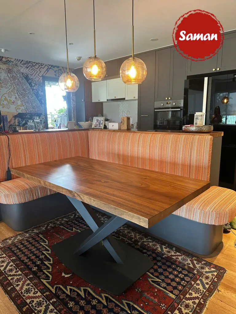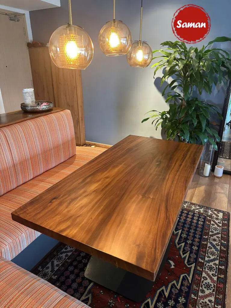 Bàn Gỗ Me Tây Chân Sắt được sản xuất bởi xưởng Saman có kiểu dáng đơn giản nhưng thanh lịch và tinh tế phù hợp với mọi không gian từ phòng ăn gia đình, căn hộ chung cư cho đến quán ăn, nhà hàng.