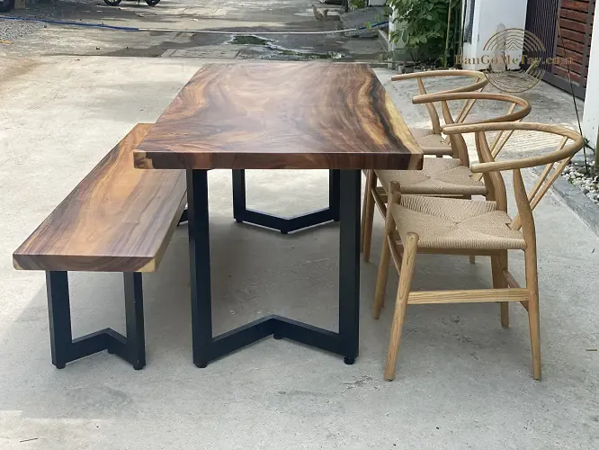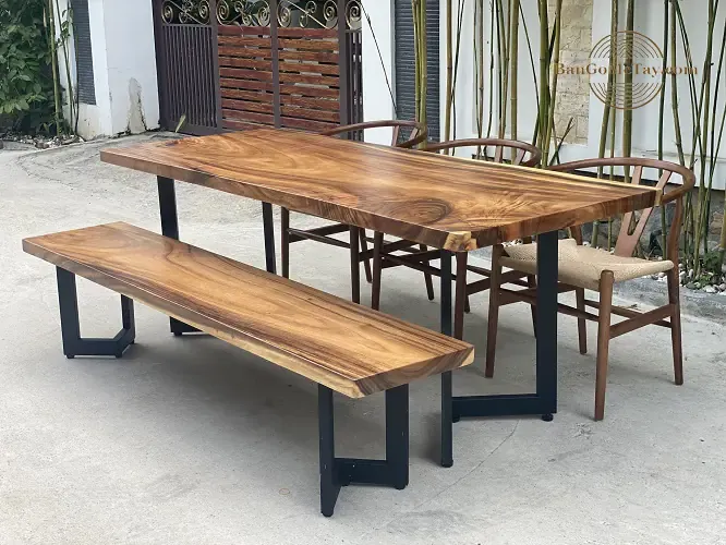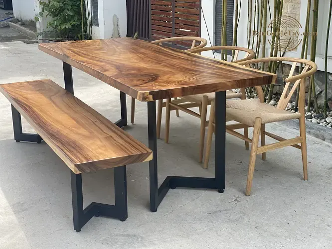 Bộ bàn ăn sang trọng từ gỗ me tây nguyên tấm với sự kết hợp giữ 1 băng dài và ghế rời hiện đại.