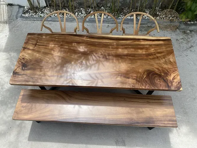 • Ghế Băng gỗ Me Tây nguyên tấm Dài 2m cũng giống như bàn ăn, ghế băng dài 2m cũng được làm từ gỗ me tây nguyên tấm, được xử lý đánh bóng bằng lớp sơn PU trong như bàn.