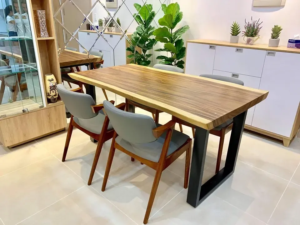 Khách mua bàn gỗ Me Tây Nguyên Tấm tạo điểm nhấn cho không gian thêm sinh động với mặt bàn tự nhiên nguyên tấm phong cách mộc.