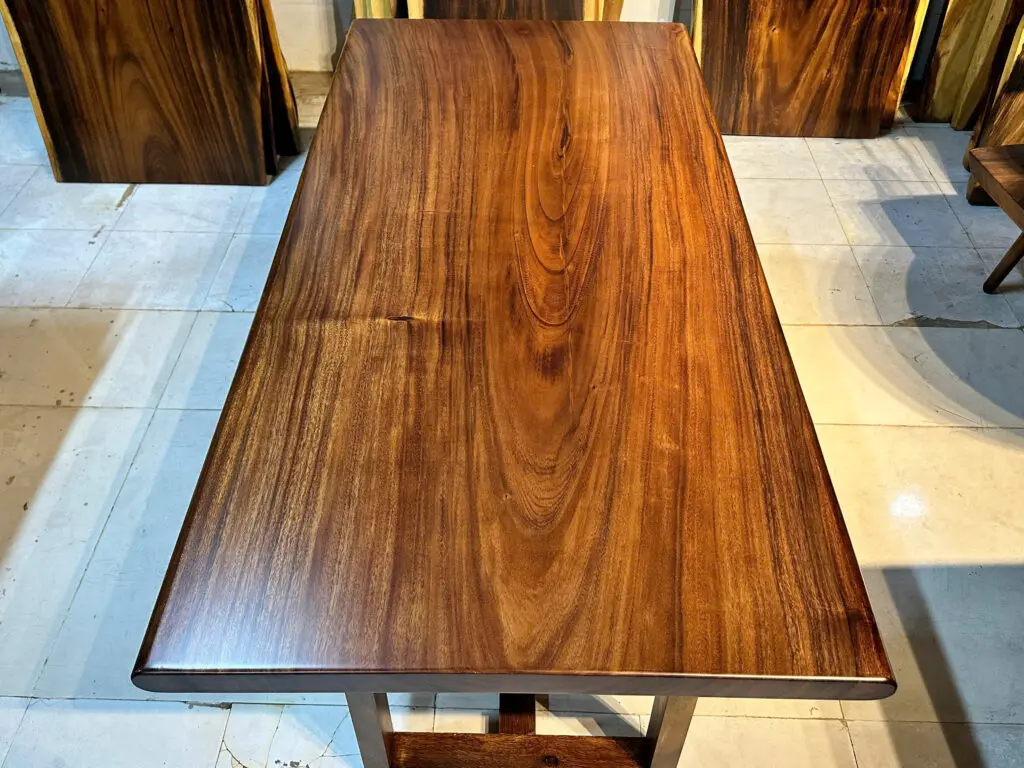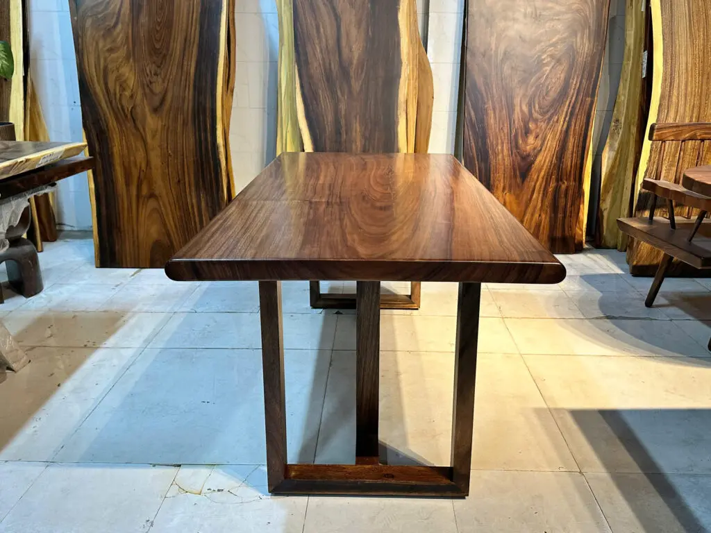 Với Thiết kế đơn giản, chắc chắn hệ vân siêu nét , cam kết tự nhiên không vẽ , bàn gỗ nguyên tấm được làm hoàn toàn từ gỗ me tây tự nhiên, nguyên tấm, nhập khẩu, chất lượng đạt chuẩn xuất khẩu. Phù hợp với phong cách bàn ăn, bàn làm việc …. bàn được xử lý sấy tẩm , đánh bóng bằng lớp sơn PU cũng góp phần làm tăng vẻ đẹp của gỗ.