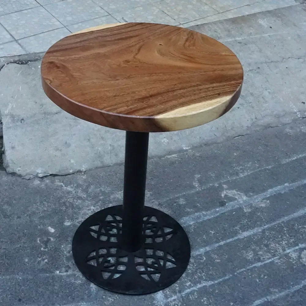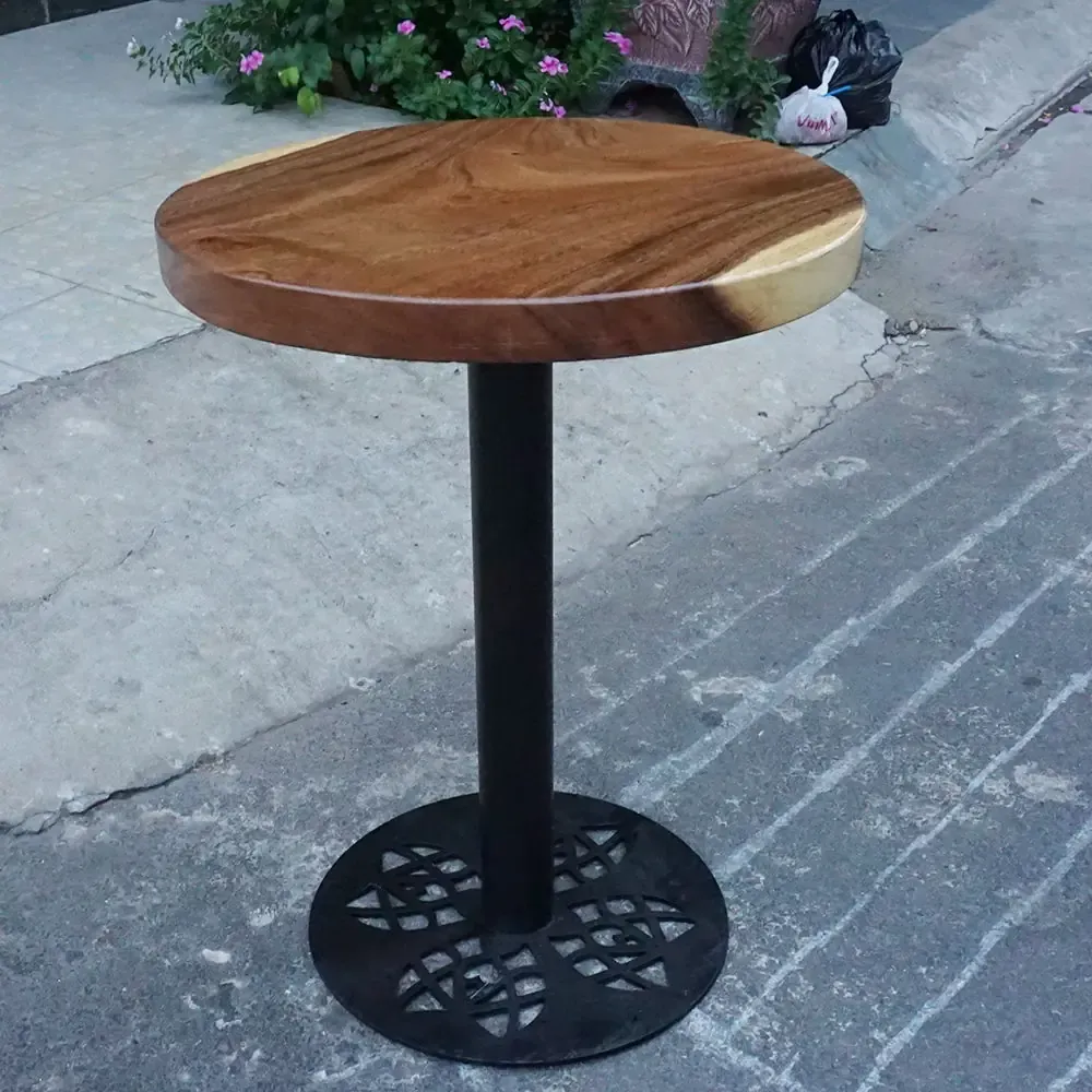 Bàn cafe tròn gỗ me tây dày 5cm chân sắt hoa văn,mặt bàn kích thước theo nhu cầu khách hàng, vân gỗ đẹp được sấy và xử lý bề mặt PU kỹ càng, bàn me tây mang vẻ đẹp sang trọng, hiện đại kết hợp với cấu trúc dơn giản, tiết kiệm diện tích không gian.