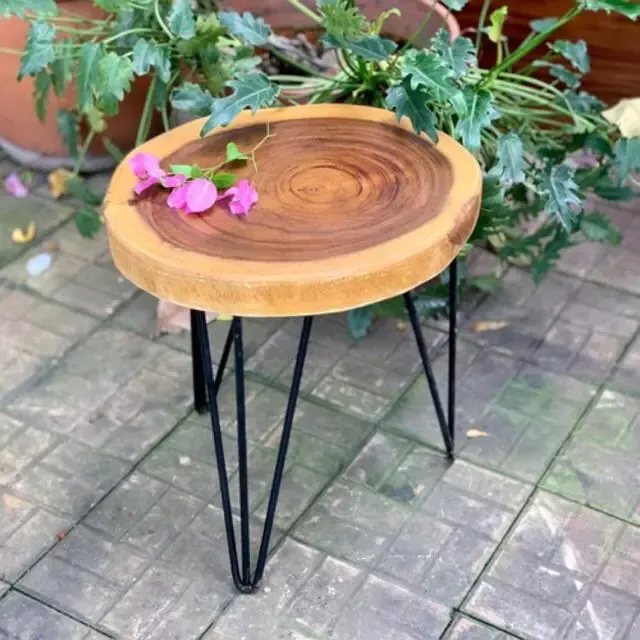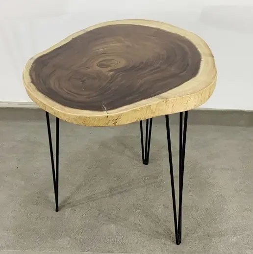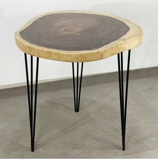 Bàn Cafe tròn Gỗ Me Tây Nguyên Tấm dày 5cm chân Hairpin đừng nhìn vẻ thanh mảnh nhé chắc chắn lắm đấy bởi hai yếu tố là mặt bàn gỗ Me Tây Nguyên Tấm dày 5cm nặng kết hợp với chân sắt Hairpin sử dụng sắt đặc phi 10mm chân rất chắc chắn, mặt bàn vân siêu đẹp với viền ngoài vàng và cạnh tự nhiên của gỗ Me Tây bên trong vân tối rất đẹp.