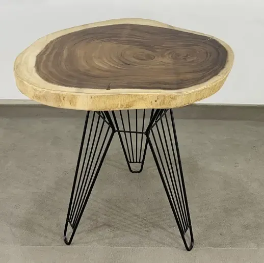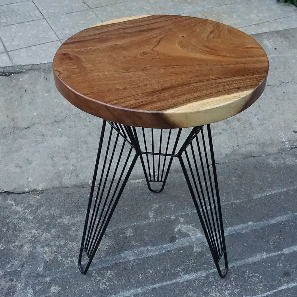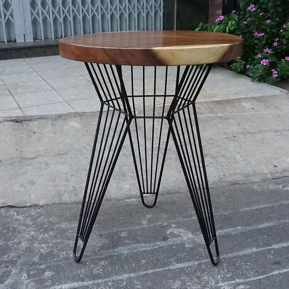 Bàn cafe tròn gỗ Me Tây Nguyên Tấm dày 5cm chân sắt Sọc Phikiểu chân lạ mắt sơn tĩnh điện đen kết hợp với mặt bàn tròn gỗ me tây viền theo thân tự nhiên rất đẹp mắt, gỗ me tây nguyên tấm với viền ngoài vân vàng sáng và bên trong vân tối cực đẹp, điểm nhấn cho quán cafe, ban công căn hộ hay khu relax văn phòng đều đẹp mắt.