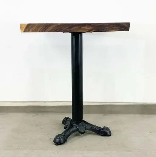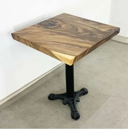Bàn cafe vuông gỗ me tây dày 5 cm chân gang đúc 3 chĩa mặt bàn kích thước theo nhu cầu khách hàng, chân gang đúc. Mặt gỗ được sấy và xử lý bề mặt PU kỹ càng, mặt bàn nguyên tấm mang vẻ đẹp sang trọng hiện đại kết hợp với chân sắt haripin đơn giản, tiết kiệm diện tích.