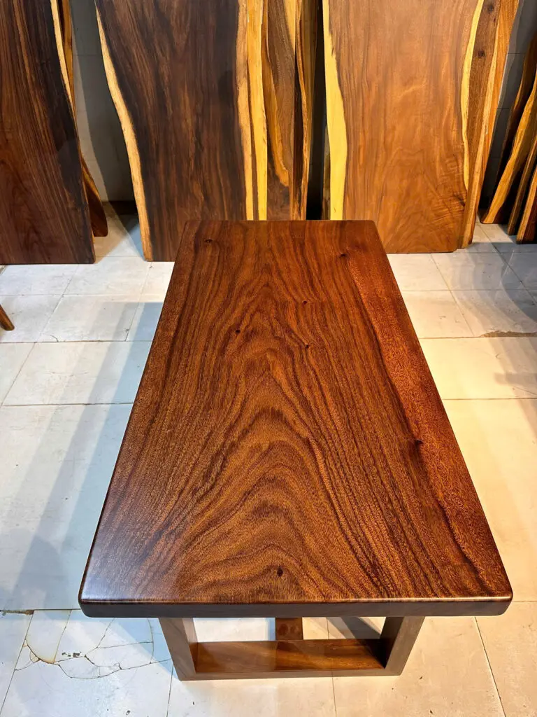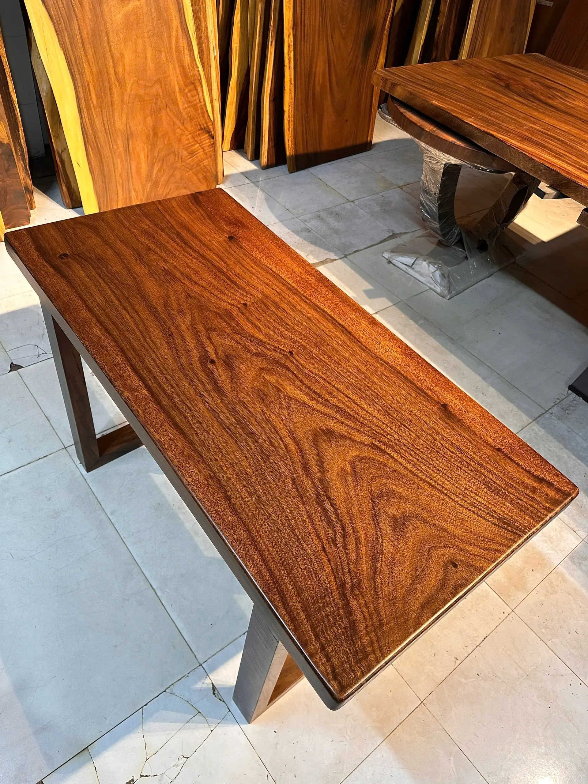 Mặt bàn gỗ Me Tây (còn gọi là gỗ Còng) được chế tác từ những tấm gỗ nguyên khối, nổi bật với vân gỗ uốn lượn độc đáo và gam màu nâu vàng – nâu sẫm đầy cuốn hút. Mỗi tấm gỗ là một “tác phẩm nghệ thuật” duy nhất, không trùng lặp, mang đến sự khác biệt cho không gian.