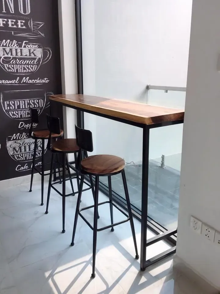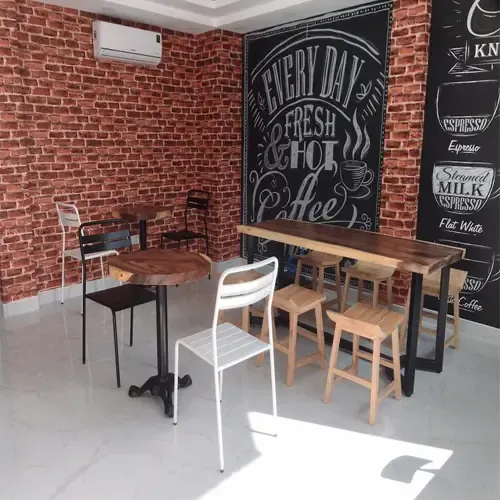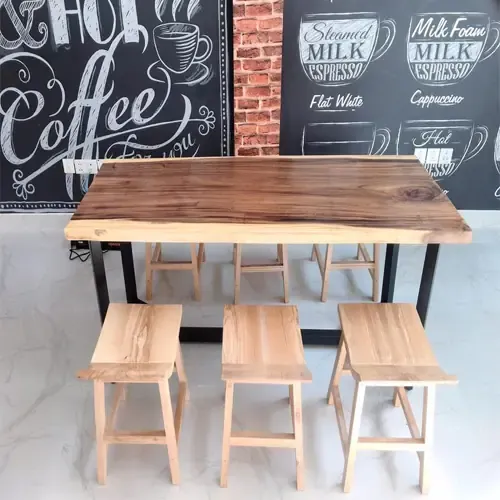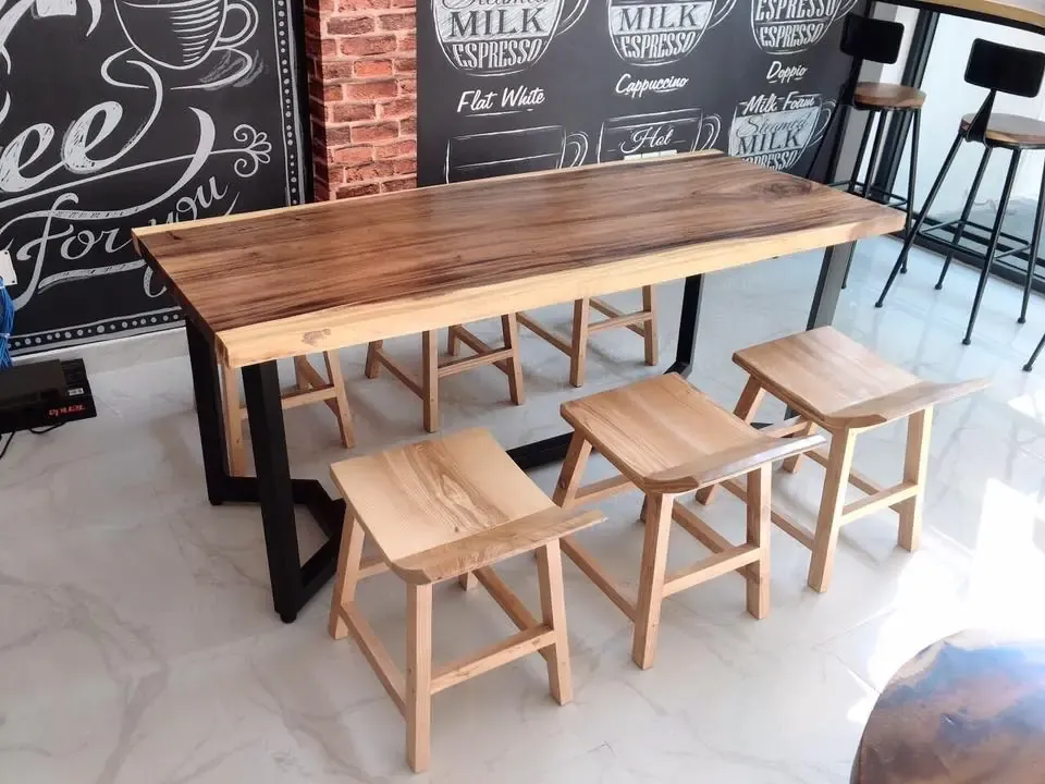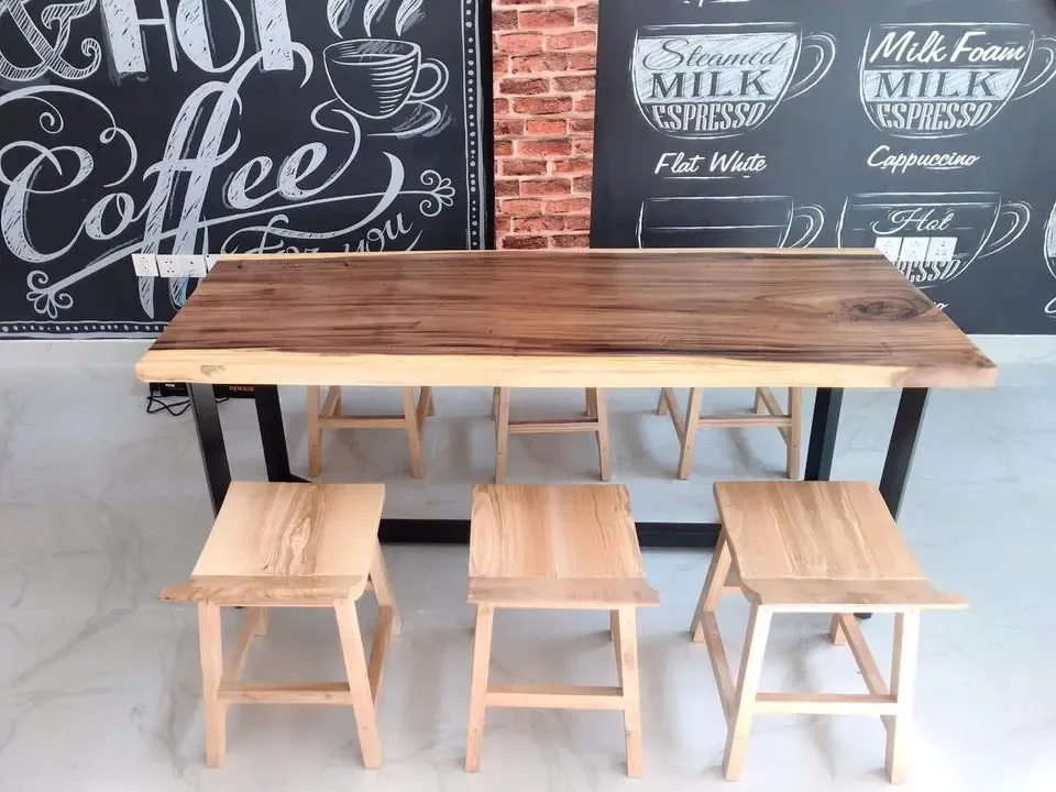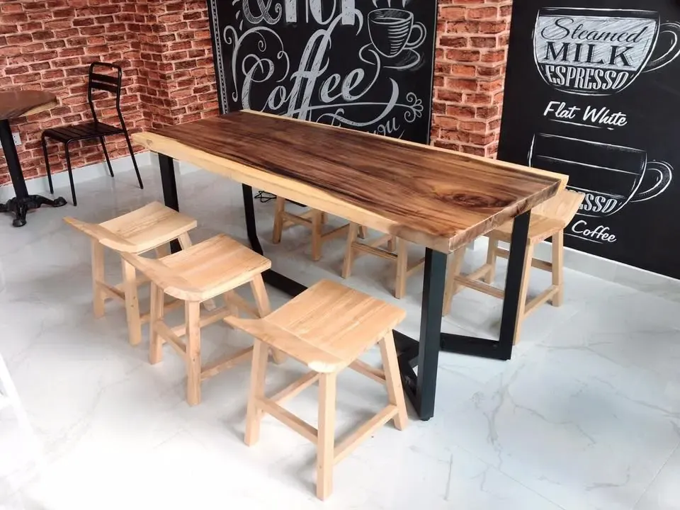 Khách mua bàn ghế gỗ Me Tây Nguyên Tấm cho quán cafe, trà sữa tạo điểm nhấn cho không gian quán thêm sinh động với mặt bàn tự nhiên nguyên tấm phong cách mộc.