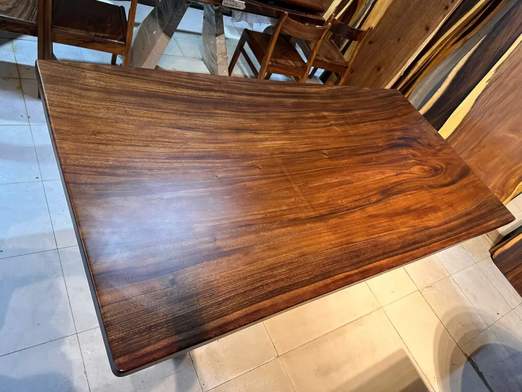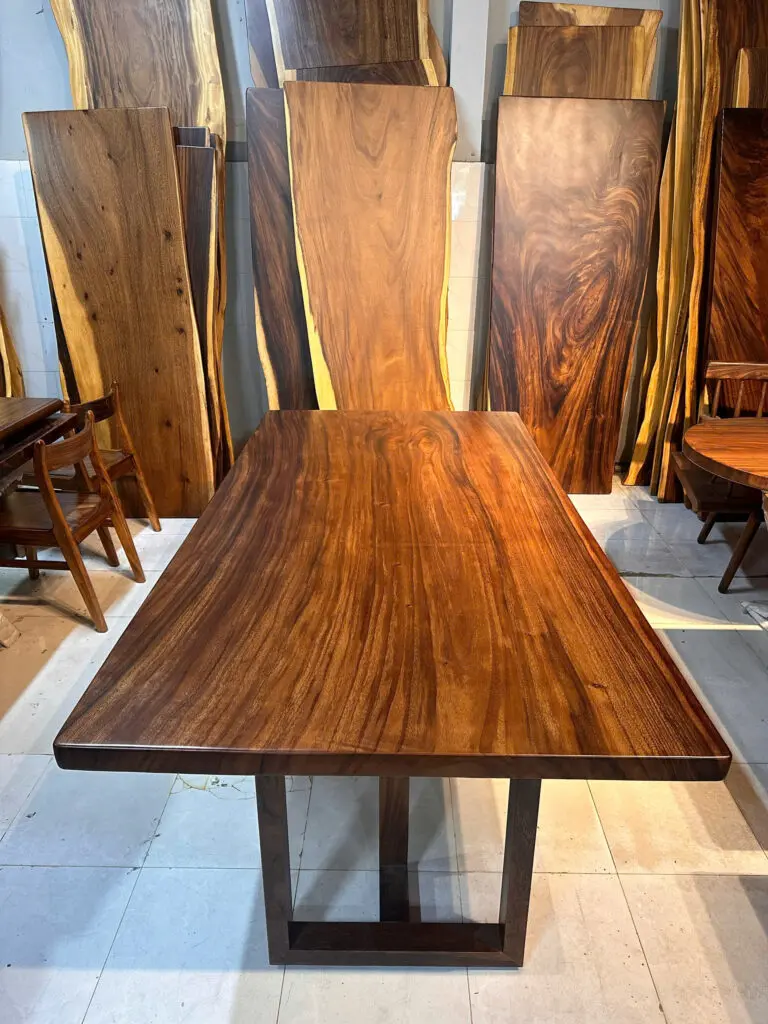 Với Thiết kế đơn giản, chắc chắn hệ vân siêu nét , cam kết tự nhiên không vẽ , bàn gỗ nguyên tấm được làm hoàn toàn từ gỗ me tây tự nhiên, nguyên tấm, nhập khẩu, chất lượng đạt chuẩn xuất khẩu. Phù hợp với phong cách bàn ăn, bàn làm việc …. bàn được xử lý sấy tẩm , đánh bóng bằng lớp sơn PU cũng góp phần làm tăng vẻ đẹp của gỗ.