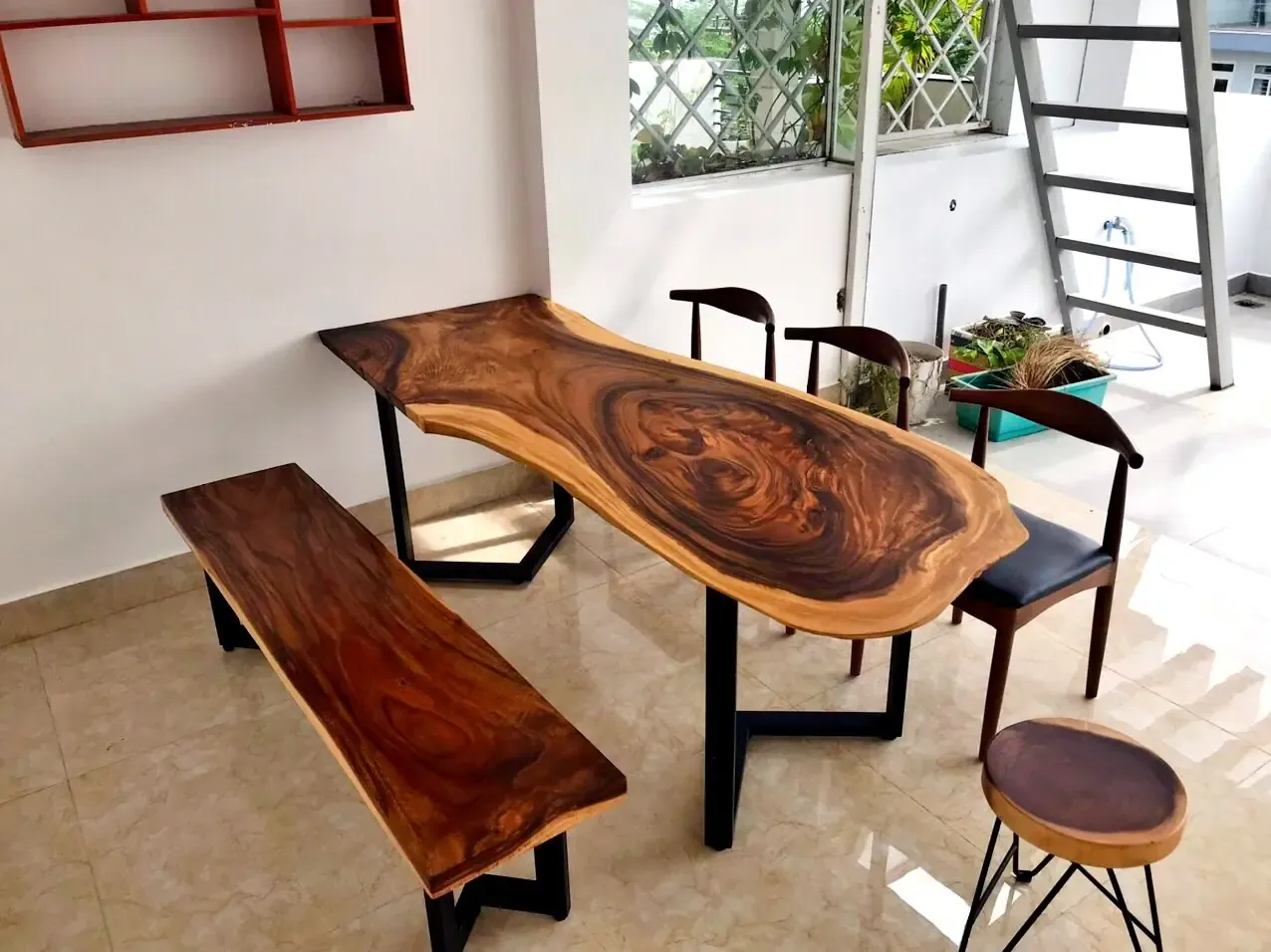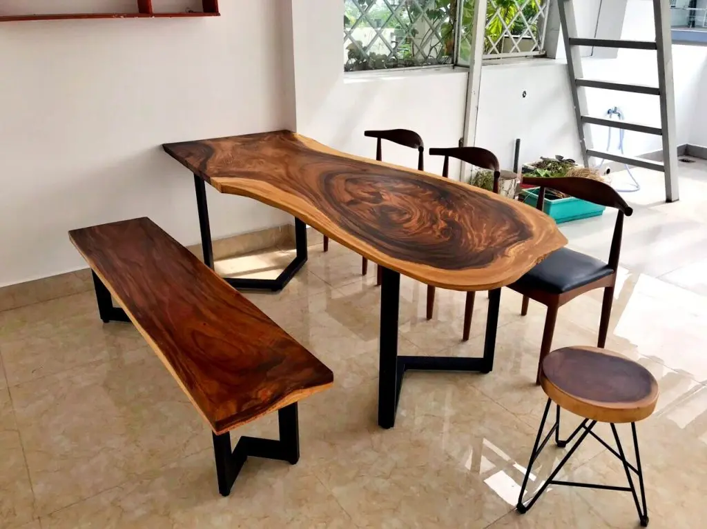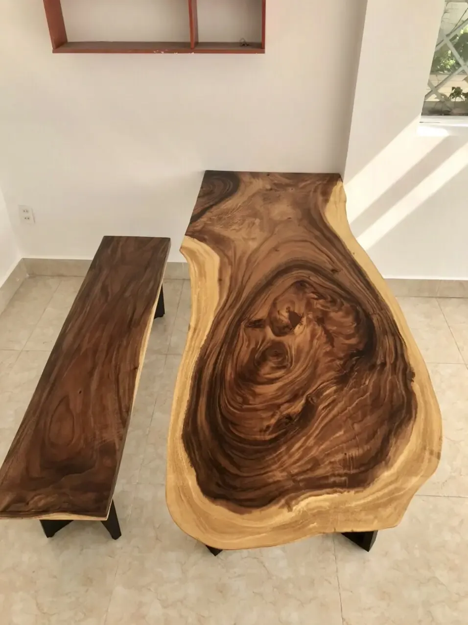 Bộ sản phẩm bàn gỗ tự nhiên ghế gỗ kết hợp chân sắt được thực hiện bởi bangonguyentam.vn. Hotline/Zalo: 0812.286.286, luôn được khách hàng ưa chuộng vì vẻ đẹp tự nhiên không đụng hàng, bền theo năm tháng và có thể kết hợp với mọi không gian