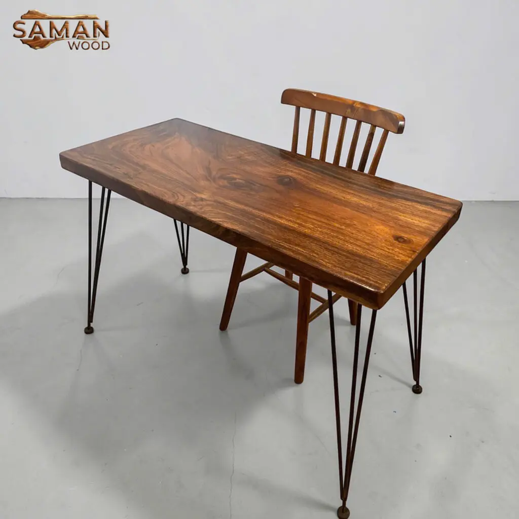chân sắt Hairpin là một lựa chọn mang tính đột phá về thẩm mỹ. Nếu gỗ Me Tây đại diện cho sự quyền quý, độc bản với những đường vân uốn lượn phức tạp, thì chân Hairpin lại mang đến sự nhẹ nhàng, giúp “giảm bớt” sự nặng nề của khối gỗ đặc.
