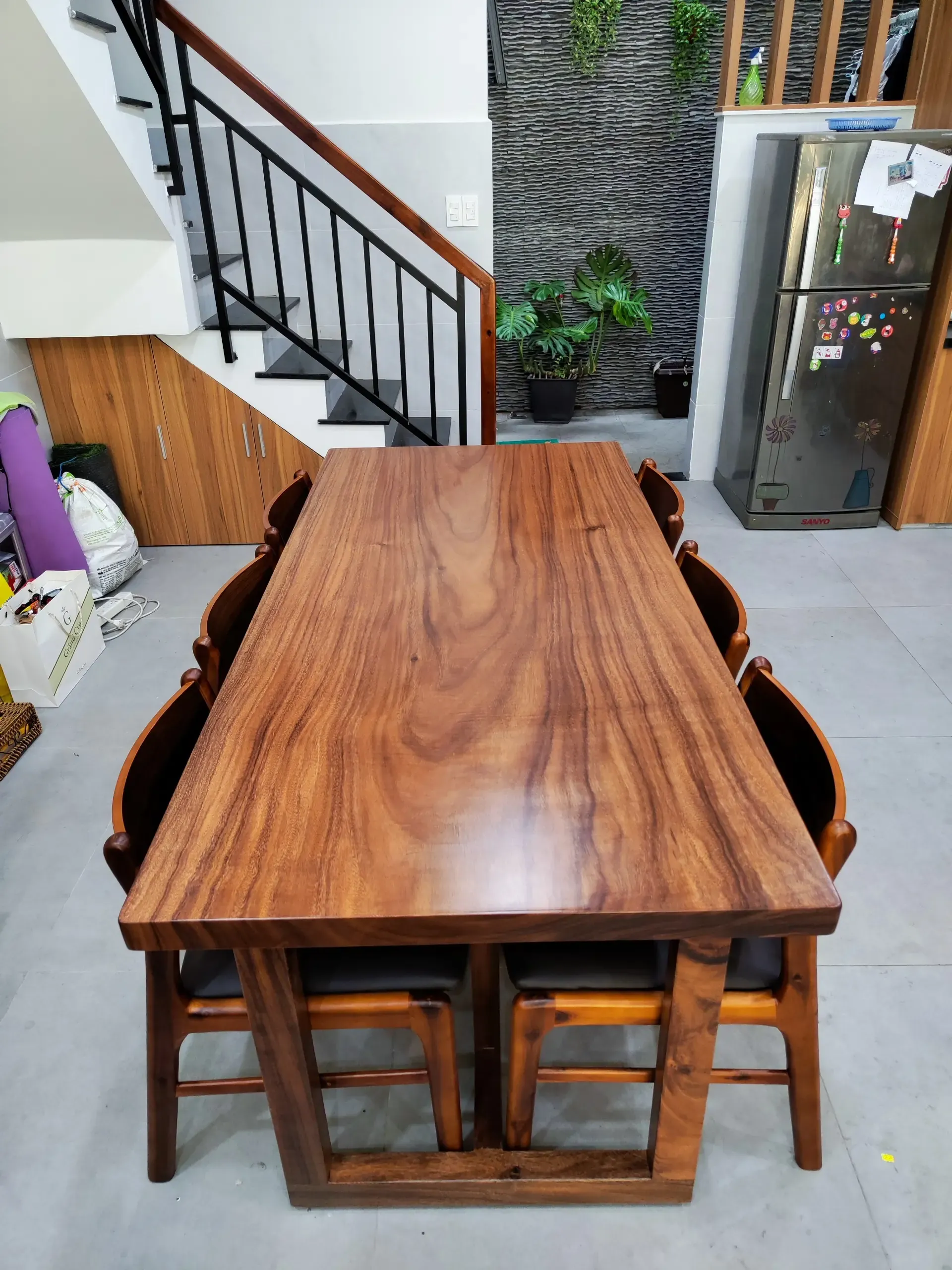 Sự kết hợp giữa bộ bàn gỗ me tây tự nhiên và 6 ghế rời Benla (gỗ Tràm) tạo điểm nhấn cho không gian phòng khách thêm sang trọng, cảm giác người ngồi thoải mái, không vướn víu.