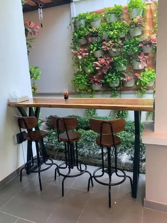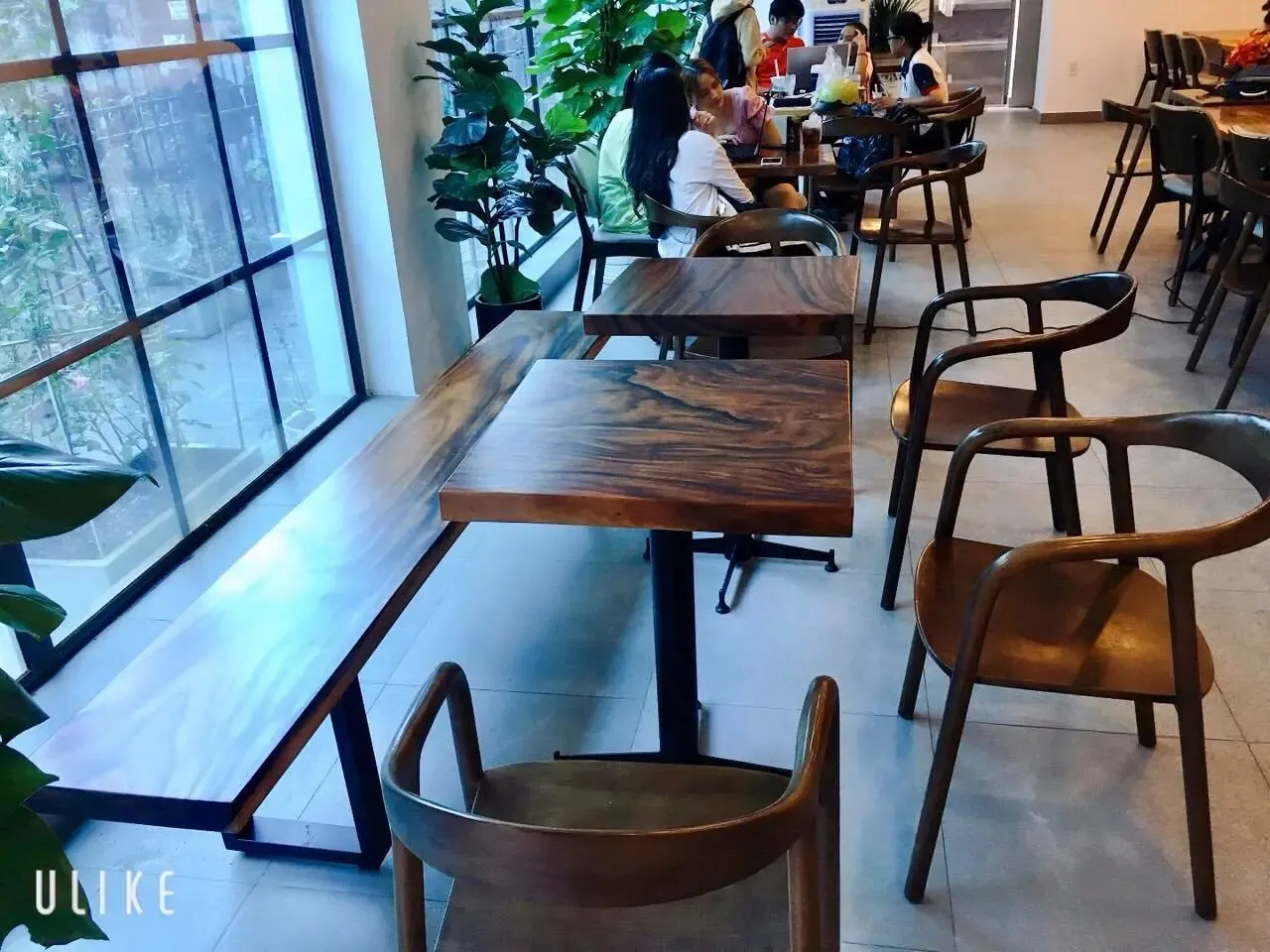 Khách mua bàn ghế gỗ Me Tây Nguyên Tấm cho quán trà sữa, cafe tạo điểm nhấn cho không gian quán thêm sinh động với mặt bàn tự nhiên nguyên tấm phong cách mộc.