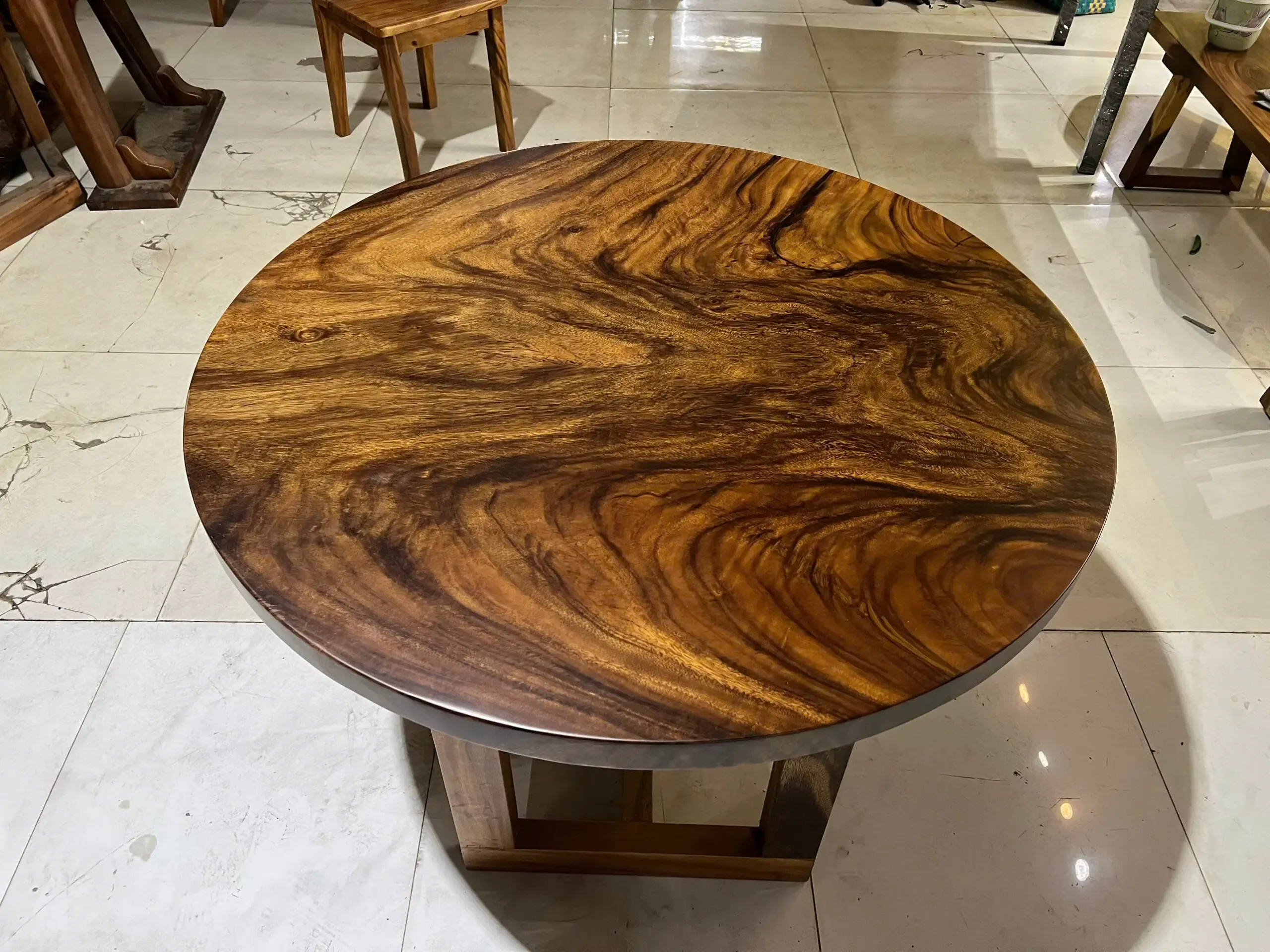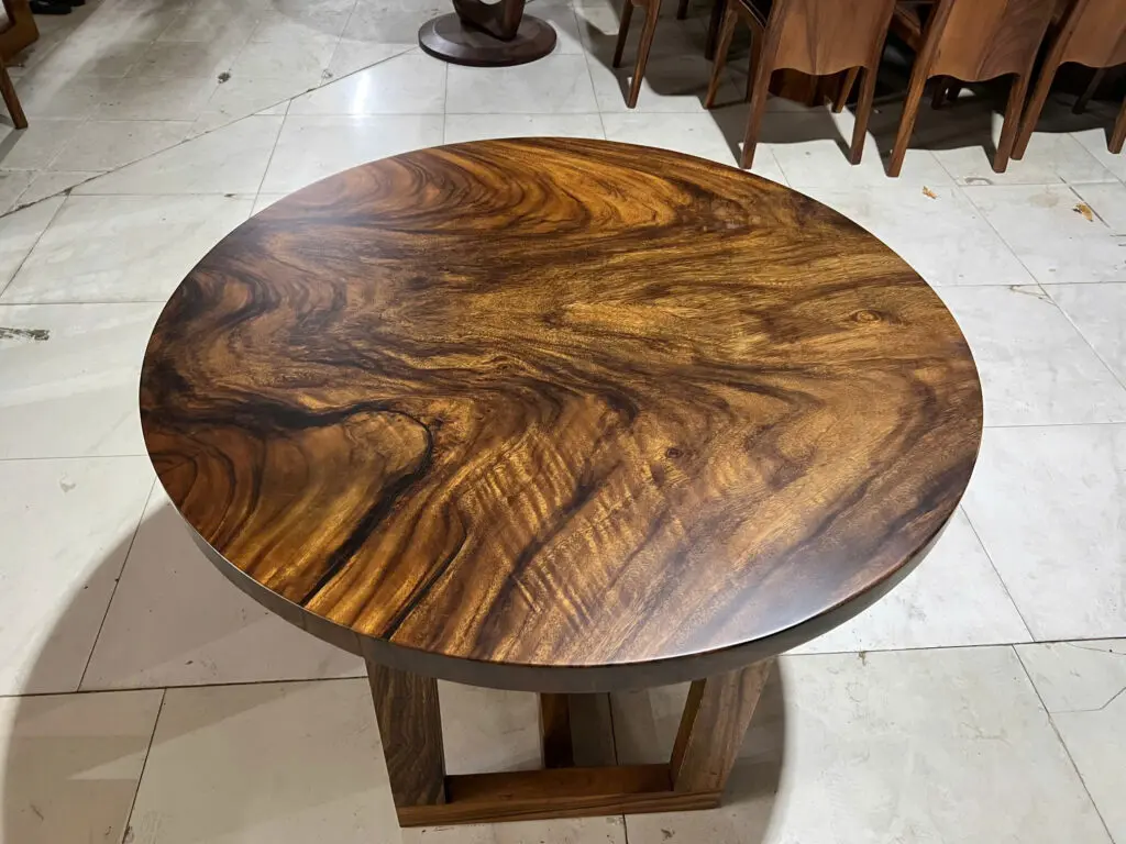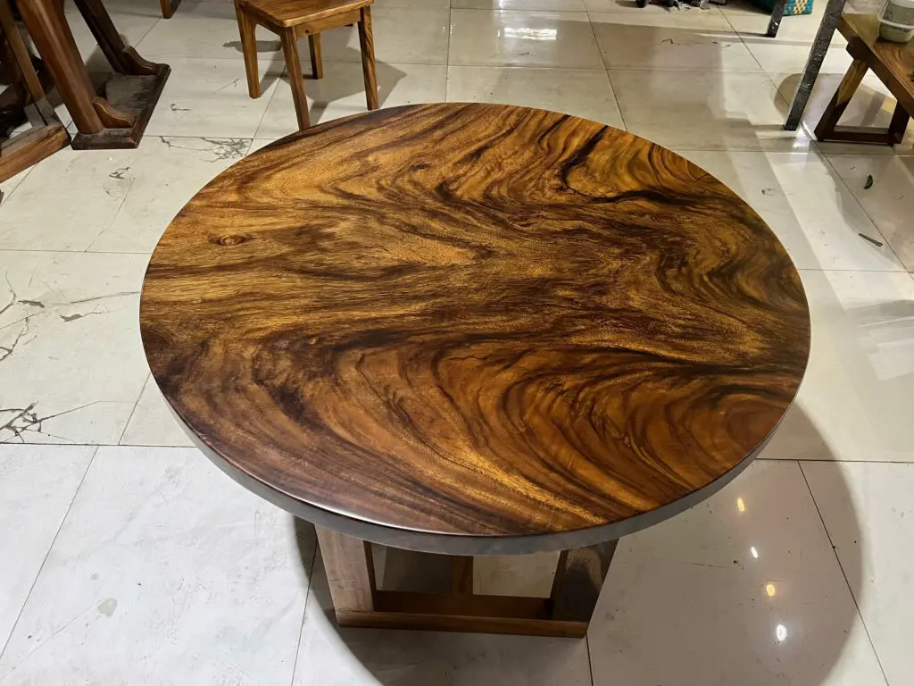 MẶT BÀN TRÒN GỖ ME TÂY SIÊU VÂN 110CM được sản xuất bởi xưởng Công ty TNHH Saman Wood có kiểu dáng cơ bản ứng dụng cho mọi không gian phòng bếp, phòng khách, sân vườn